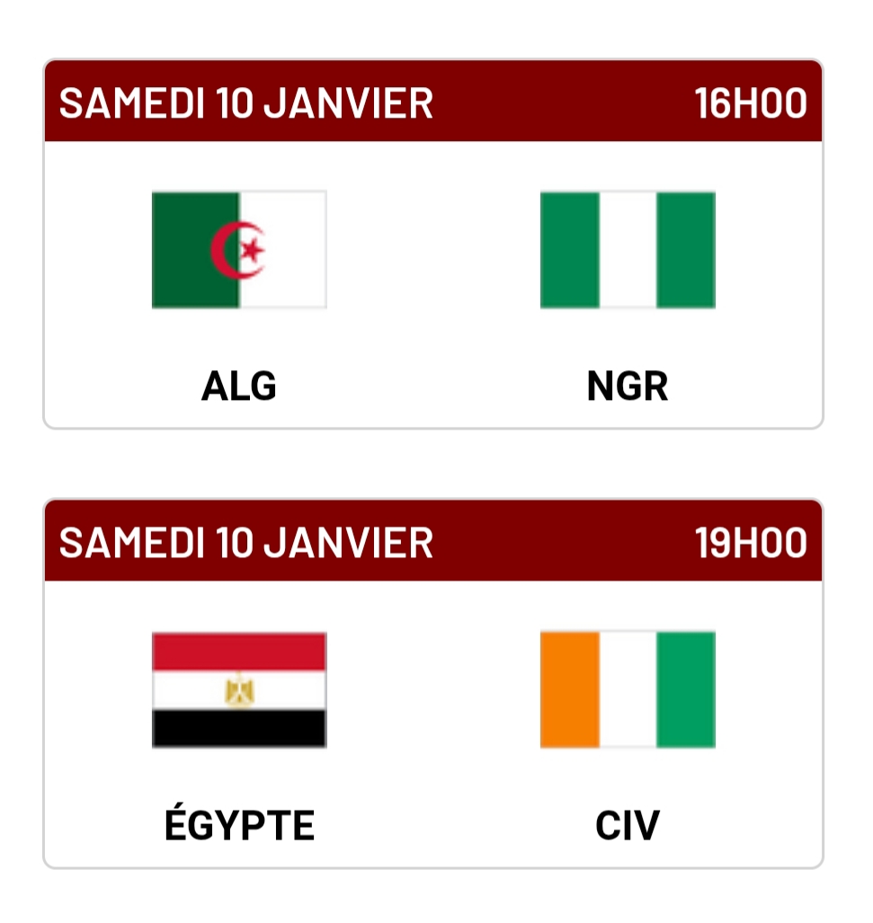 Deux confrontations de haut niveau qui opposent des sélections historiques : Algérie–Nigeria, deux puissances du football africain, puis Égypte–Côte d’Ivoire, opposant un recordman de titres aux champions en titre.